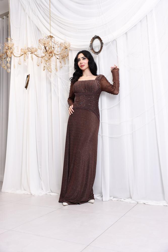 فستان سهرة بني بتصميم استرتش لامع يمنحك إطلالة خيالية تلفت الأنظارو يتميز بخامته المرنة التي تنسدل على الجسم بنعومة وتبرز الأنوثة و مع لمسة تطريز أنيقة تضيف فخامة واضحة حيث يكون الاختيار المثالي للمناسبات المتميزة والسهرات الخاصة.
